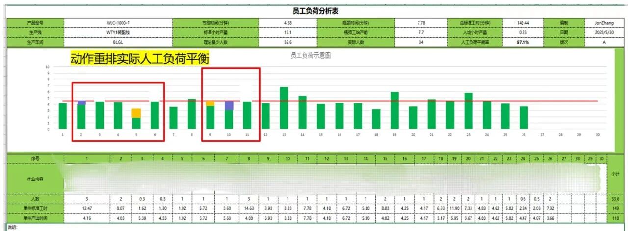 Töötajate töökoormuse määr on suutlikkuse parandamise põhielement. Protsesside ebaühtlaste tsükliaegade tõttu oli tegelik toodang suhteliselt madal. Kasutades varasemate liinide tasakaalustamise täiustuste käigus kogutud kogemusi, asus ME osakond juhtima algatusi tootmisliini töötajate töökoormuse tasakaalu suurendamiseks. Rakendades protsesside optimeerimiseks ECRS põhimõtet (Eliminate, Combine, Rearrange, Simplify) saavutas töötajate töökoormuse tasakaalu määr üle 82%.