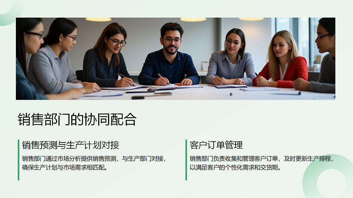Müügiosakonna tellimuste esitamine tähistab kogu keti alguspunkti, mistõttu on nõudluse täpne prognoosimine ülioluline. Nidec Elevator Motors purustab osakondadevahelised tõkked ja võtab kasutusele "raudse kolmnurga" juhtimismudeli, mis on orienteeritud klienditeenindusele. Müügi- ja turundusosakonnad koostavad turu-uuringute, andmeanalüüsi ja muude meetodite abil esialgsed SIOP (Sales, Inventory ja Operations Planning) plaanid. Samal ajal korraldab planeerimisosakond igakuiseid SIOP koosolekuid, mis hõlmavad müügi-, inseneri-, tootmis-, hanke-, kvaliteedi- ja muid osakondi, et vaadata üle tulevased turunõudlused, tegeleda pakkumise ja nõudluse dünaamilise tasakaaluga, teha eelnevalt teadlikke otsuseid, olla turust ees ja mõista täpselt turuvajadusi, et võimaldada tellimuste saamisel kiiresti reageerida.