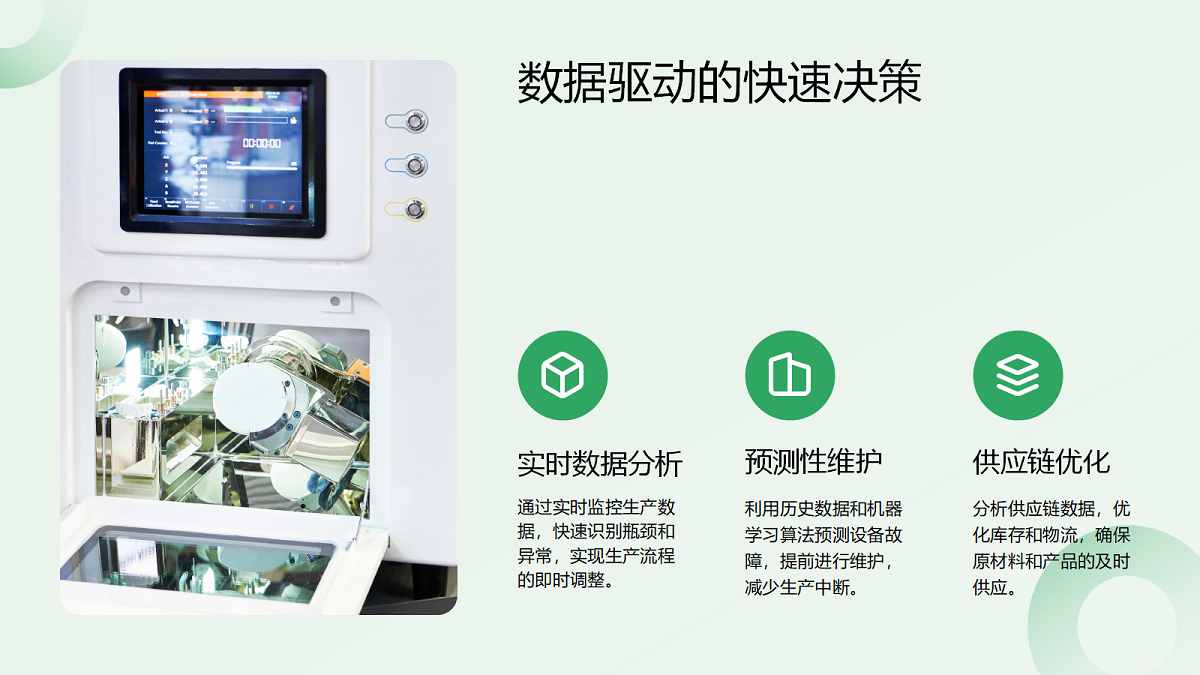 • Andmepõhine kiire otsuste tegemine: tehke kiireid vastuseid reaalajas andmeanalüüsi, ennustava hoolduse ja tarneahela optimeerimise kaudu.