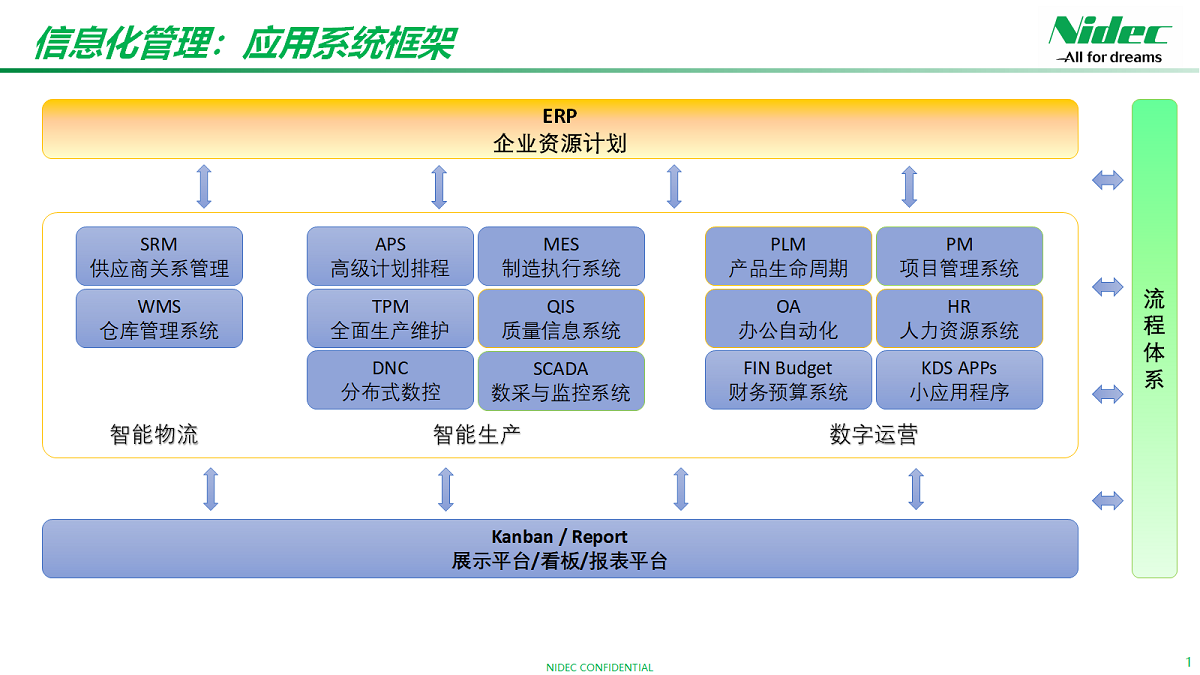 Nidec Elevator Motors on iseseisvalt välja töötanud sellised süsteemid nagu SRM (tarnijasuhete haldus), MES (tootmise täitmissüsteem), APS (täiustatud planeerimine ja ajastamine), WMS (laohaldussüsteem) ja TPM (tootlik produktiivne hooldus). See loob kogu intelligentse tootmissüsteemi automatiseerimise, digitaliseerimise, modelleerimise, visualiseerimise, integreerimise ja intelligentsuse abil, võimaldades tasakaalustatud tootmise ajakava ja paindliku nutika tootmise realiseerimist ning luues tugeva aluse tulevasele "tuletornitehase" realiseerimisele.